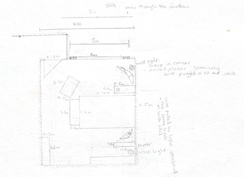 The second was for Mother's bedroom in the film, The Joker, for which I drafted a visual, ground plan and elevation which combines the script description and my personal interior design.